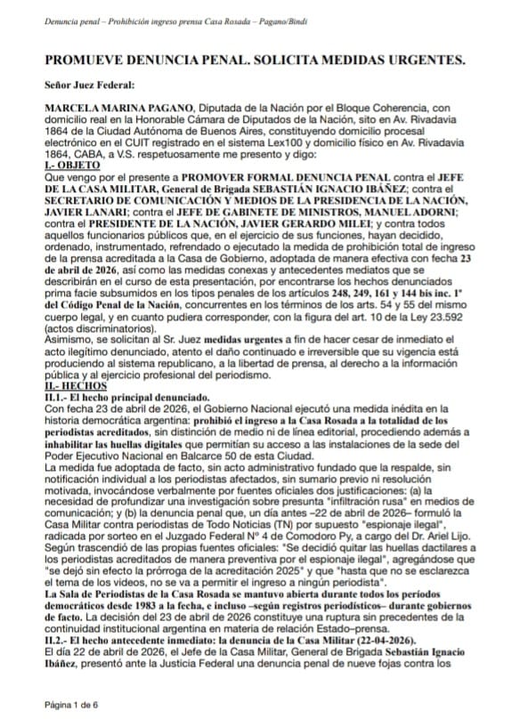 NEUQUÉN, 23 de abril de 2026. — La diputada nacional Marcela Pagano presentó una denuncia penal contra el presidente Javier Milei, el vocero presidencial Manuel Adorni y otros funcionarios del Gobierno nacional por la prohibición de ingreso de periodistas acreditados a la Casa Rosada.