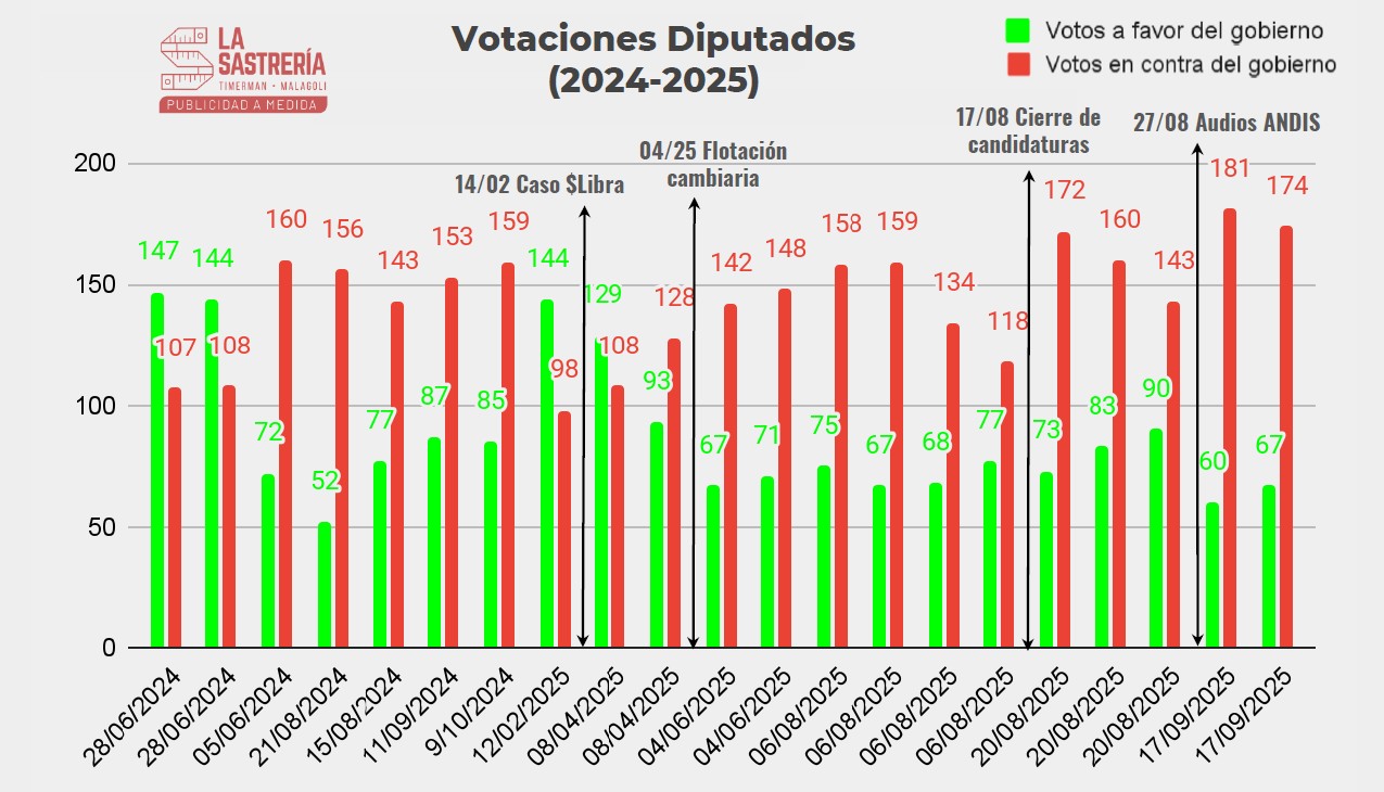 BUENOS AIRES, 12 de octubre de 2025. – Un informe elaborado por la consultora LA SASTRERÍA – TIMERMAN MALAGOLI , con fecha del 1 de octubre de 2025, detalla la dinámica de alianzas y apoyos al Gobierno nacional en el Congreso. El análisis tomó en cuenta las votaciones consideradas “políticamente relevantes” en ambas Cámaras durante 2024 y 2025, incluyendo temas como Ley Bases, Paquete Fiscal, DNU SIDE, DNU FMI, Ficha Limpia, Jubilaciones, Universidades, y vetos.